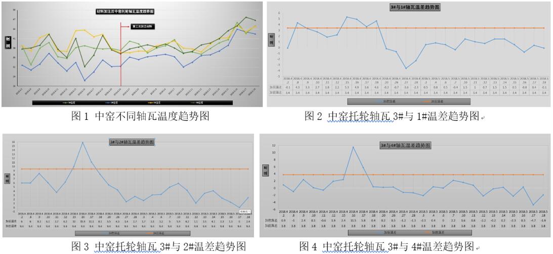 应用结果:加注前后3#托轮轴承温度与其它三个未加注轴承温度差下降明显,由平均高于1#托轮轴承3.4℃下降至0.58℃、平均高于2#托轮轴承9.4℃下降至2.98℃、平均高于4#托轮轴承3.8℃下降至-0.62℃(低于加注前)。