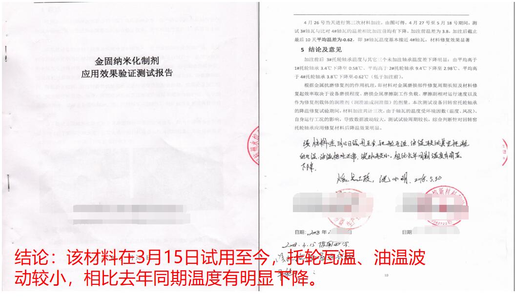 使用结果:使用了金固金属摩损表面自修复智能材料的中窑1#、2#、3#、4#托轮轴瓦的温度特征数据中,代表温度升高趋势的系数,都比没有添加修复材料的头窑四个轴瓦要低。温度升高趋势系数低,说明在同样的时间段内,剔除气温和载荷等各种影响瓦温的因素,该轴瓦温度比温度升高趋势系数高的轴瓦温度上升速度要慢。
